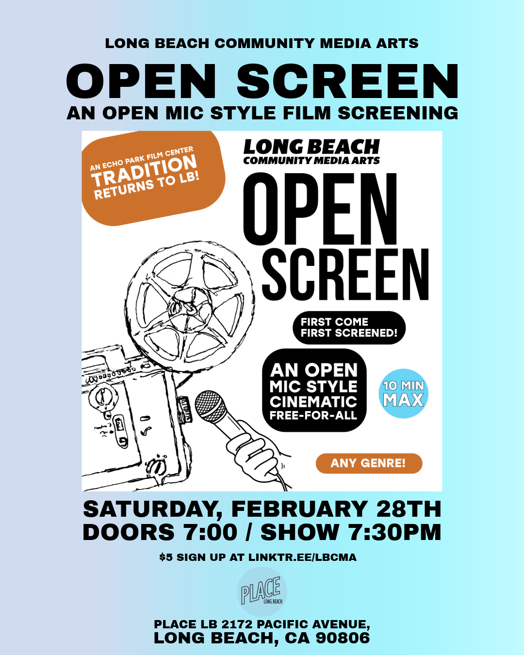 An Echo Park Film Center tradition makes its way to the city of Long Beach, CA! It’s our open mic style cinematic free-for-all, daring you to share your film with the feisty LBCMA/PLACE LB audience. Or just come and watch! Any genre! Any style! New, old, work-in-progress! First come, first screened; one film per filmmaker; 10-minute maximum. The signup sheet goes up 30 minutes before screening time. See you soon!