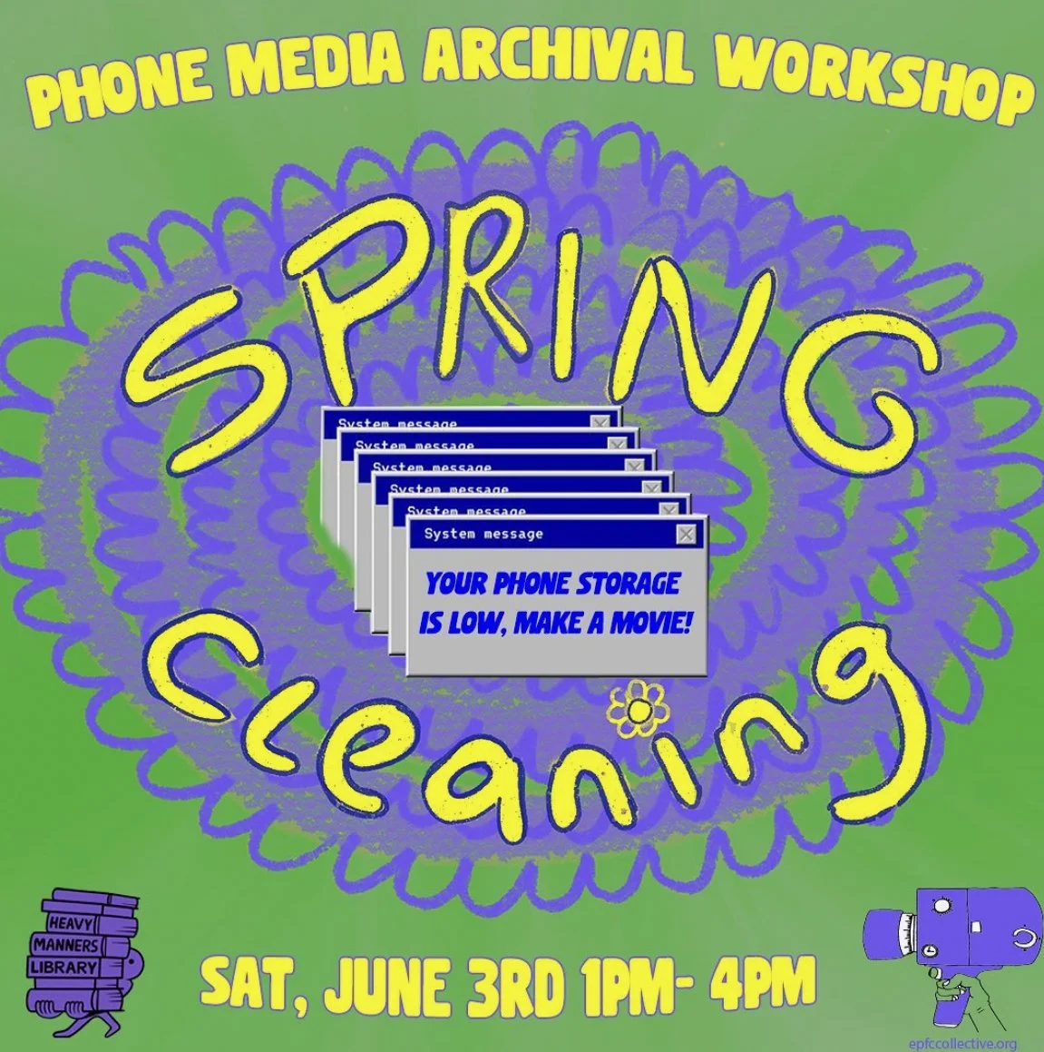 Let’s make movies with the footage we’ve accumulated on our phones! Join EPFC Collective Member Gemma on June 3 at Heavy Manners Library for a workshop on archival film/video-making. Let’s all create and de-clutter our phones at the same time!